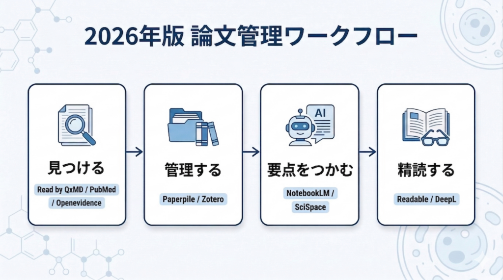 そこで今回は、2026年現在の私なりのおすすめとして、 「見つける」→「管理する」→「要点をつかむ」→「必要なものだけ精読する」 という4ステップで、手軽かつ着実に最新論文を追う方法をまとめました。