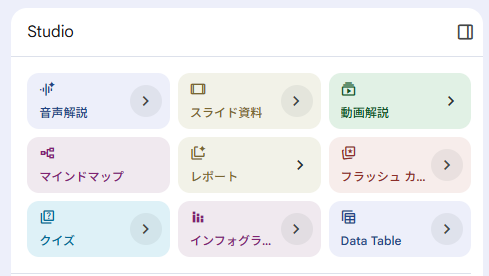 アップロードした論文ソースを元に、抄読会や研究、患者説明でそのまま使える具体的なコンテンツを生成してくれる「Studio」機能が搭載されています。
