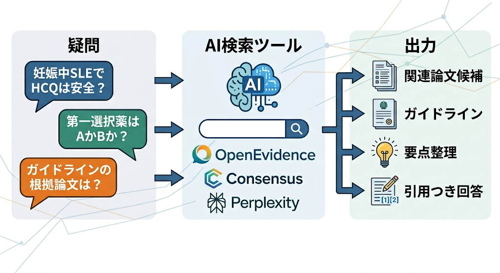 最近のトレンドとして絶対に外せないのが、AIを「検索の入り口」として使う方法です。PubMedで複雑な検索式を組む前に、まずはAIに聞いて当たりをつけるのが今のスタンダードになっています。