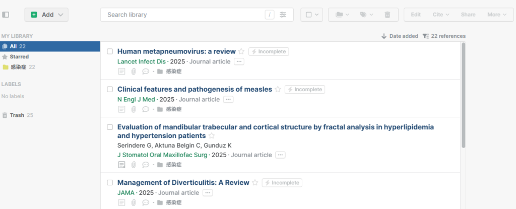 無料でありながら、ブラウザからのワンクリック保存、柔軟なタグ付け、フォルダ整理、WordやGoogle Docsでの引用文献の自動生成まで、有料ツール顔負けの機能が揃っています。