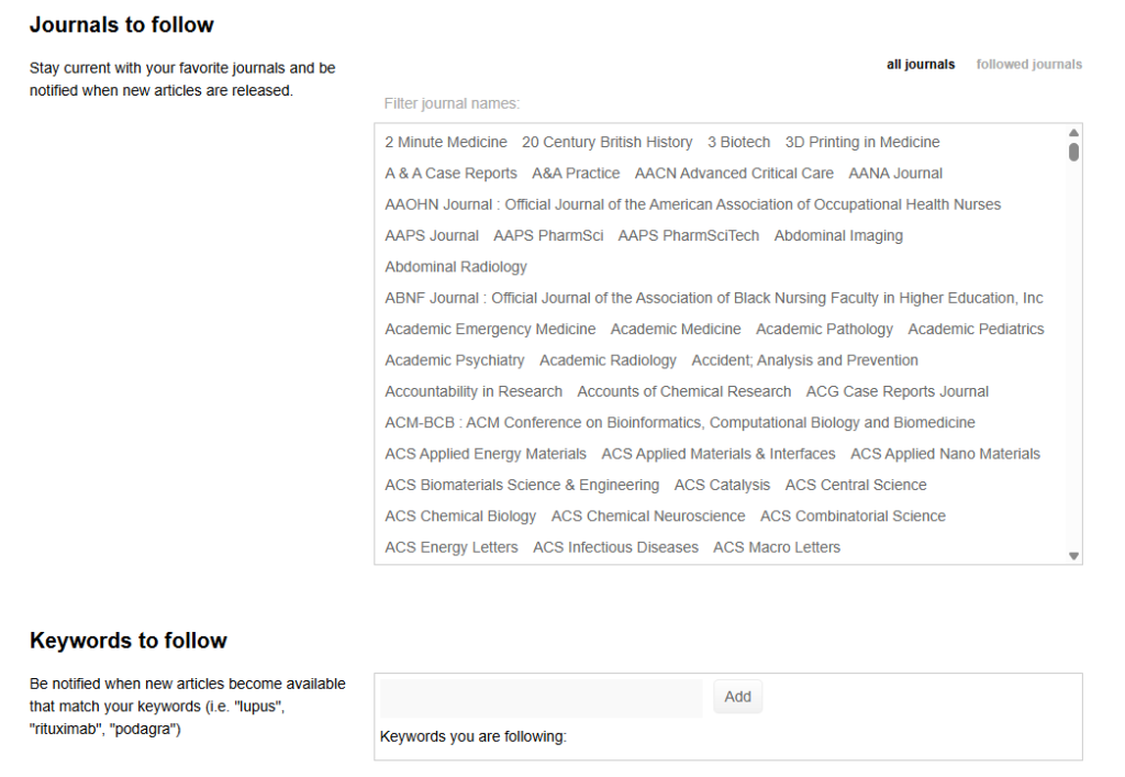 Feed Subscriptionでは自分の気になる範囲、Journal、Keywordを設定することができ、タブを切り替えて使用します。